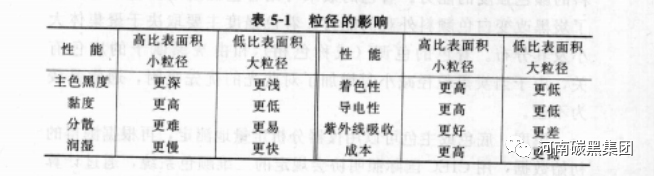 由于细微原生粒子的炭黑赋予更大的比表面积,所以需要更多的润湿能和分散能。原生粒径的作用如表5-1所示。
